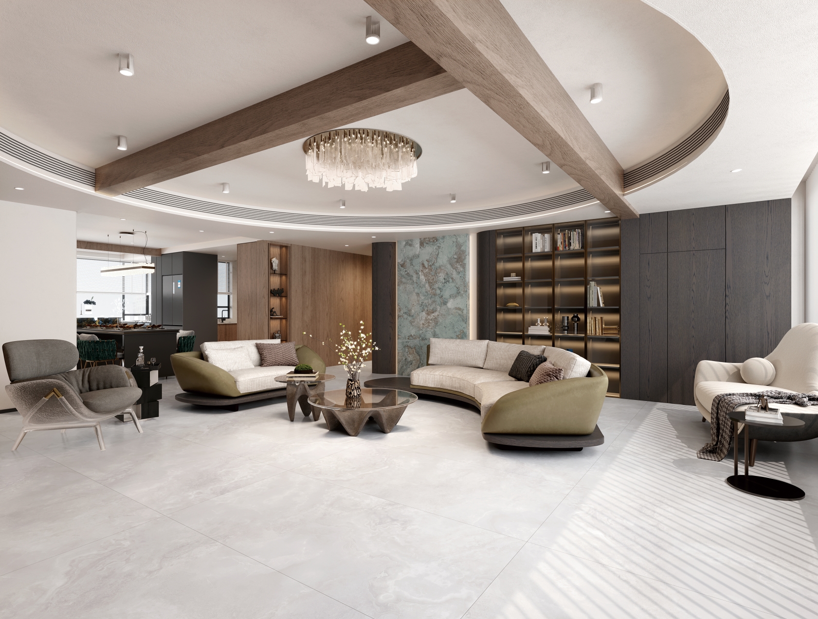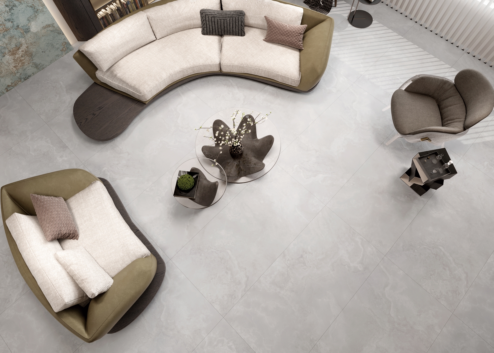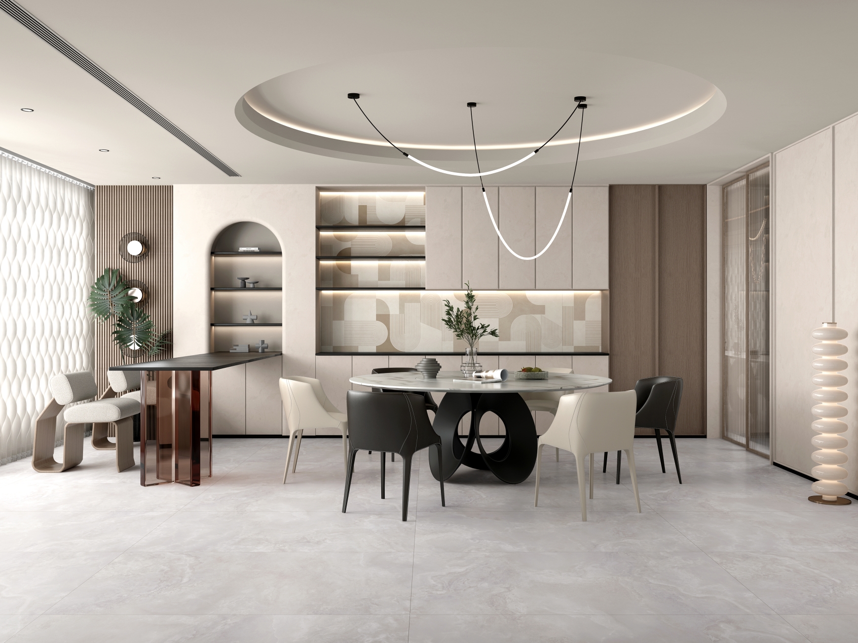 自然通透細膩,灰色線條、肆意飄散的紋理,深淺變化不一縱情延伸, 在空間里獨自綻放光彩,營造了獨特隨性的空間氛圍。