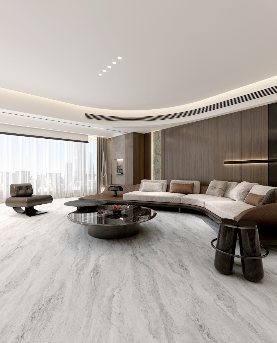 剛?cè)岵?jì)的灰色和凹凸立體的肌理質(zhì)感,在光影交錯(cuò)中更顯層次豐富;細(xì)膩交織的白色石紋悠然貫穿于灰色基底之上,與灰調(diào)自然相融,宛如清澈溪流輕盈穿梭于石隙之間,靈動(dòng)而寧?kù)o。