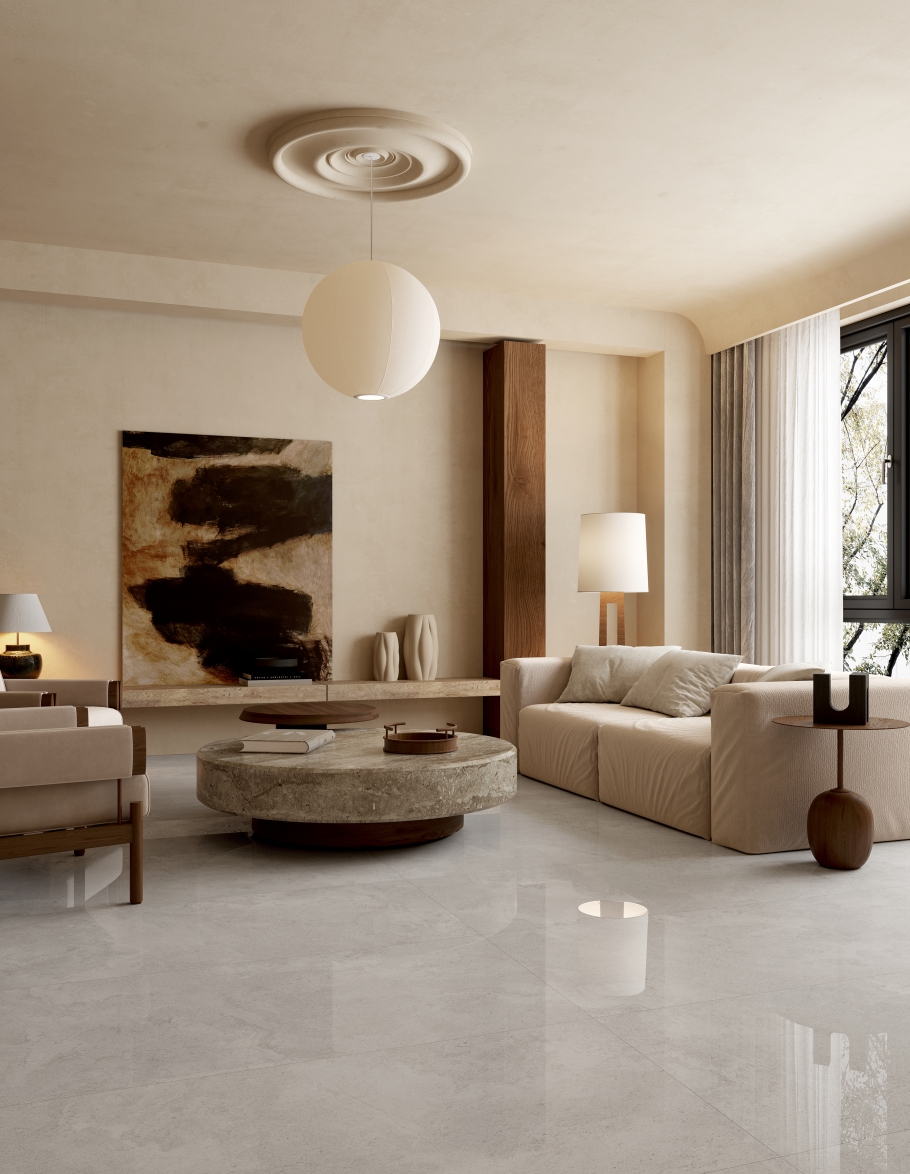 獨特時尚的米杏色調(diào),變幻莫測的漸變紋理流動,彷如歲月的雕琢,給空間帶來連貫、完整、延伸的無垠視界。